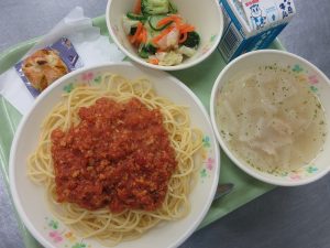 献立は、スパゲッティミートソース マスタードサラダ 鶏肉と大根のスープ ハロウィンパンプキンパイ 牛乳でした。
