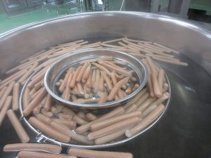 「ホットドッグ」のウインナーを沸騰しない温度で温めます。水をきってパンにはさみます。