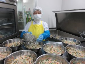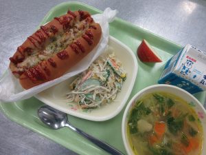 今日の給食は、ごぼうサラダやホットドッグ・りんごなど、よくかんで食べるメニューです。