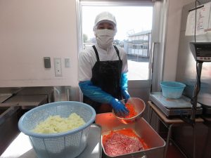「ハンバーグ」の具材を合わせて、よくこねます。