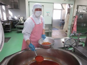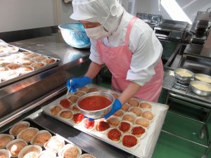 今日の給食は、トマトソースとチーズをのせたイタリアンハンバーグです。