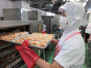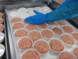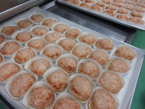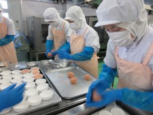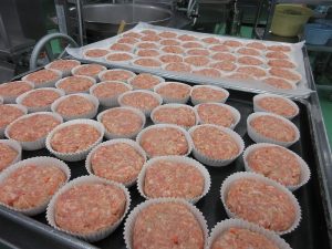 重さを量ったハンバーグを丸くして、カップの中に入れていきます。