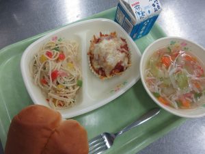 献立は、はちみつパン イタリアンハンバーグ スパゲッティソテー コンソメスープ 牛乳でした。