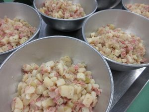 玉ねぎを甘みが出るように炒めて、ベーコンを入れます。蒸したじゃがいもと合わせて完成です!