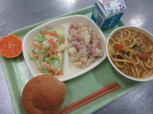 献立は、黒糖パン カレーうどん ベーコンポテト コールスローサラダ みかん 牛乳でした。
