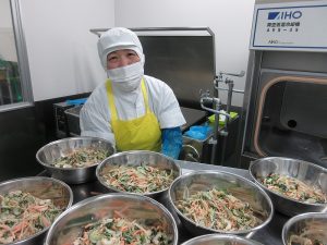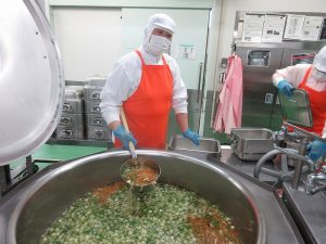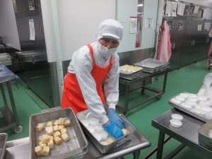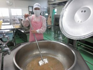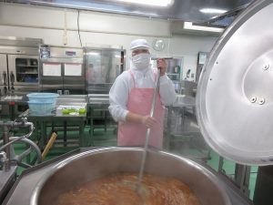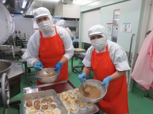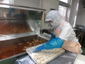 今日の給食は、肉みそをかけた「揚げ出し豆腐」です。