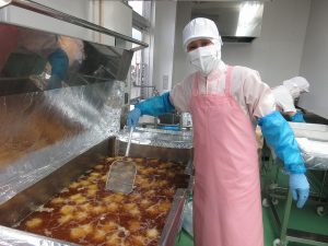 絹豆腐にかたくり粉をまとわせます。そして、やわらかいお豆腐をやさしく油の中に入れていきます。