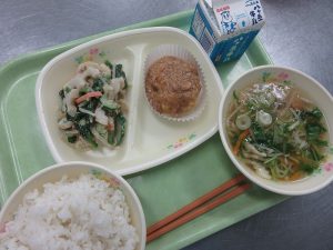 献立は、ごはん 揚げ出し豆腐の肉みそあんかけ マヨポンサラダ 沢煮椀 牛乳でした。