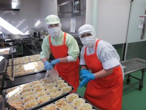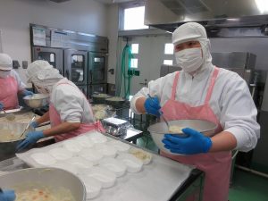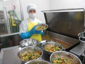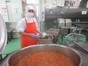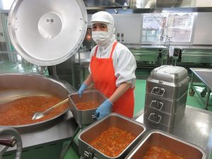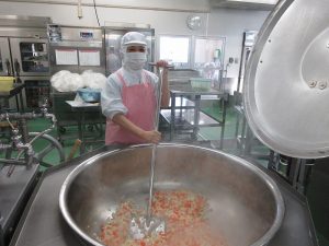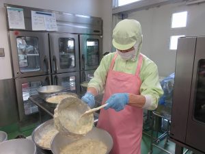 給食室では「やはたいも」を四角に切って、やわらかくなるまでゆでました。