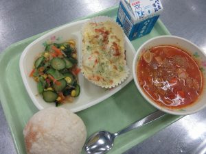 献立は、そぼろパン やはたいものクリームグラタン 糸寒天サラダ ミネストローネ 牛乳でした。