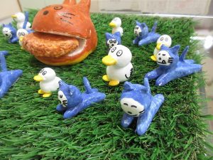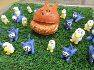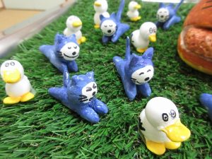 今回も、調理員さんが最終日のコラボ給食のために、時間をかけて紙粘土で「11ぴきのねことあほうどり」を作ってくれました。給食のメニューのねこパンとコロッケを中心にねこたちとあほうどりが楽しく遊んでいます。小さいけど表情豊かなねこたちです。