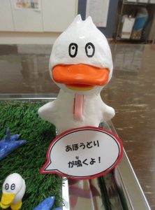 お菓子のおもちゃを改造して、首にあるスイッチを押すと「グワァ グワァ」と鳴くあほうどりも作ってくれました。