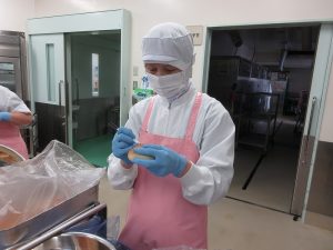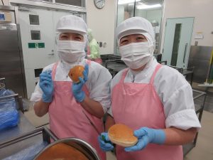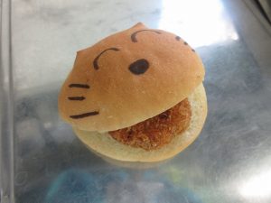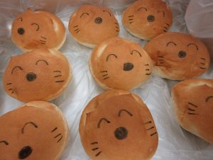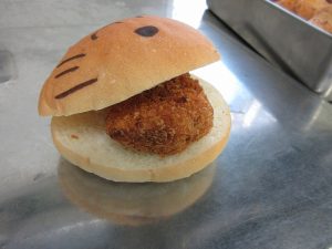 今日は、パン屋さんがパンにねこ耳をつけて焼いてくれました!このパンをコロッケがはさめるように、給食室で包丁で切れ目を入れて口をつくり、食用ペンでねこの顔を描きました!