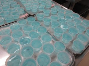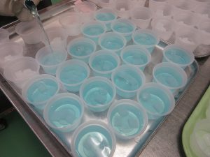 ゼリー液にブルーハワイのシロップを入れて淡いブルーの色にしました。