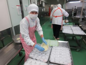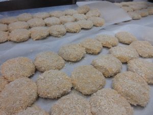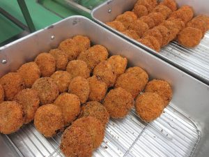 重さを量って、丸い形をつくり、バッター液にくぐらせてパン粉をまぶしていきます。