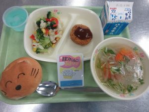 献立は、ねこパン 11ぴきのねこのコロッケ カラフルサラダ チキンスープ ソーダゼリー 牛乳でした。