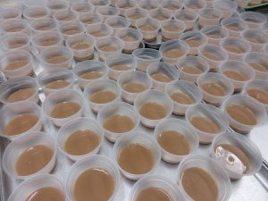 今日のデザートは「カフェオレゼリー」です。はじめに、コーヒーゼリーを作って入れ物に注ぎます。次にミルクと生クリーム入りカフェオレゼリーを作って、カップに注ぎます。