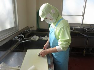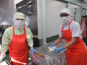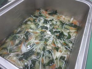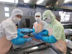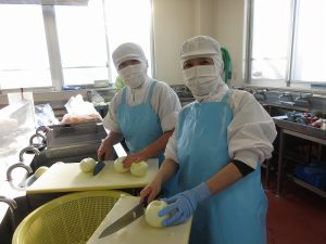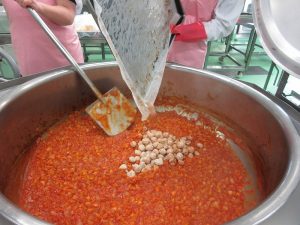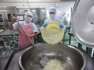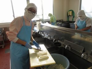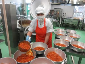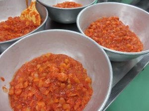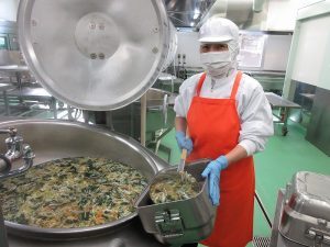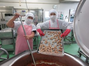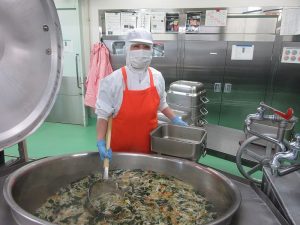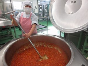 煮込み料理は、朝からコトコト煮込んで作っています。トマトの酸味がとれて、子どもたちにも食べやすい味になるように給食室みんなで愛情込めて調理をしています。