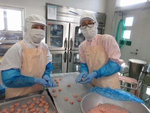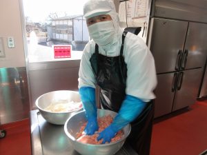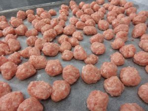 肉だんごの材料を合わせて、よくこねます。そして小さい肉だんごをたくさん作ります。