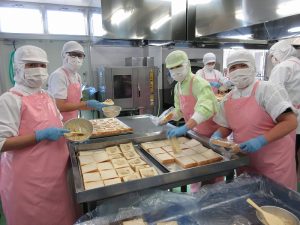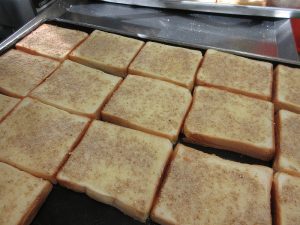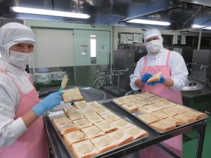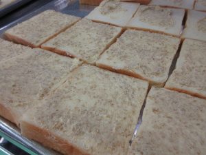 「セサミトースト」です。食パンに1枚1枚、ごまとグラニュー糖入りマーガリンをぬっていきます。