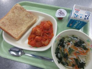 献立は、セサミトースト ラタトゥイユ ジュリエンヌスープ ミニグレープゼリー 牛乳でした。