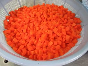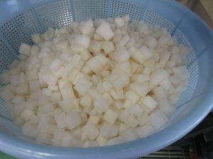 「ミネストローネ」のにんじんと大根は、小さい四角に切ります。