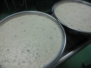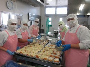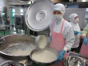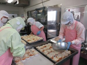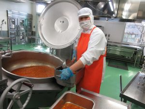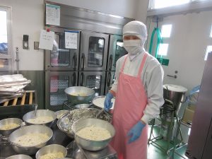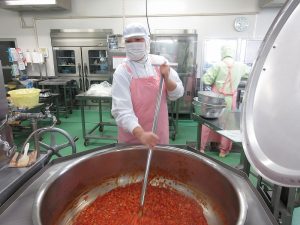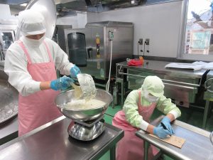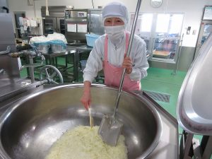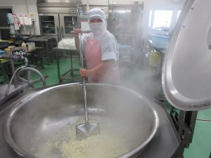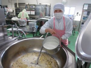 「パングラタン」のホワイトソースをつくります。まずは、こげないように玉ねぎなどの材料を炒めます。次に牛乳を入れて煮込みます。