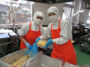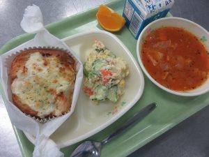 献立は、パングラタン カレーポテトサラダ ミネストローネ オレンジ 牛乳でした。
