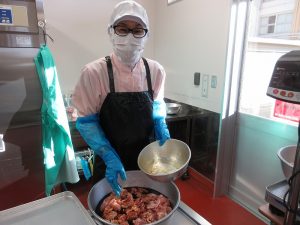 人気の「鶏肉のからあげ」です。鶏肉を調味料にしっかりと漬け込んで、かたくり粉をまぶします。