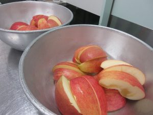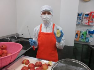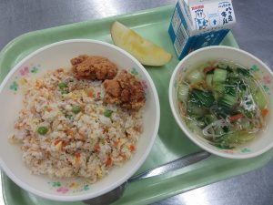 献立は、卵入りチャーハン 鶏肉のからあげ 中華スープ りんご 牛乳でした。