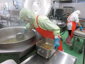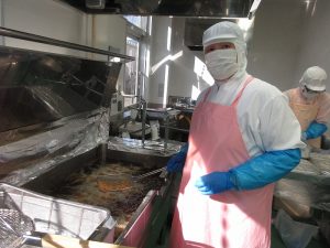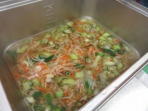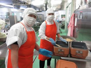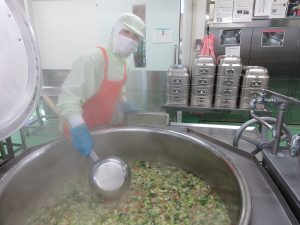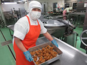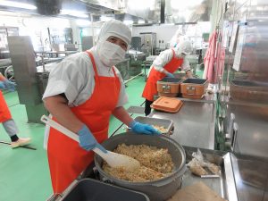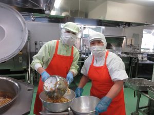 ねぎ油の香りが給食室に広がります。具を炒めて、卵と合わせます。
