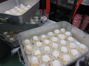 「クリスマスデザート」です。まず、ミルクレープに雪をイメージして、粉砂糖をふりました。