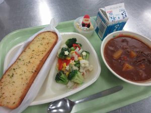 献立は、ガーリックトースト 甲州ワインビーフのビーフシチュー キラキラサラダ クリスマスデザート 牛乳でした。