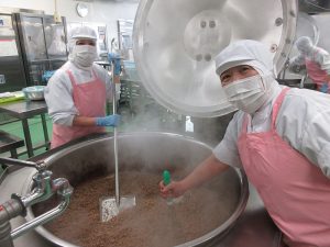 「ビビンバの具」です。調味料に漬け込んだひき肉をぽろぽろに炒めます。そして、水分をとばしながら味を染みこませていきます。