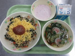 献立は、ビビンバ もずくスープ フルーチェ 牛乳でした。