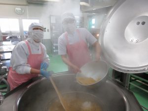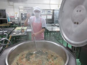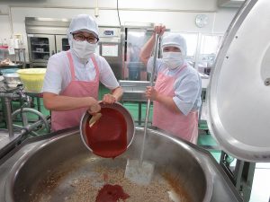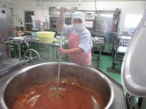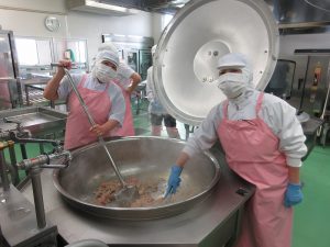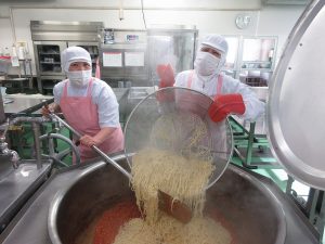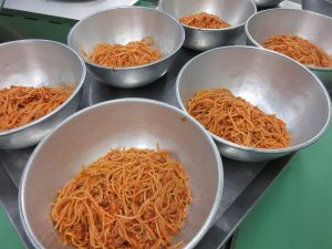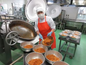 「ミートスパゲッティ」です。みじん切りの玉ねぎとひき肉を炒めます。トマトピューレやケチャップなどを入れてトマトの酸味がまろやかになるように煮こみます。