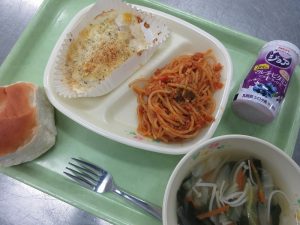 献立は、こどもパン 白身魚のパン粉焼き ミートスパゲッティ ジュリエンヌスープ ジョア(ブルーベリー味)でした。