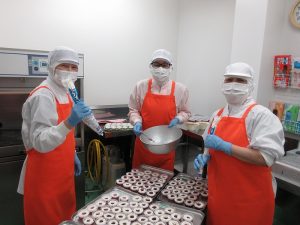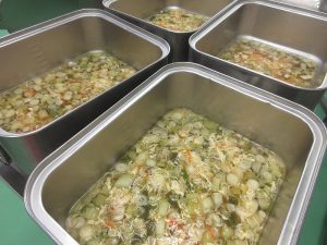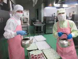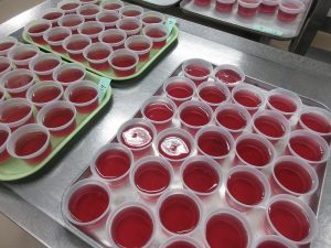 今日のデザートは「グレープゼリー」でした。まずは、グレープゼリー液をカップに注ぎます。