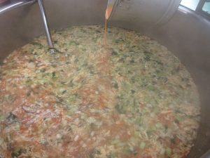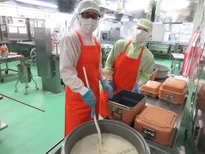 少しピリ辛のふっくらたまごのお汁です。ごはんは、甲斐市産の「ヒノヒカリ」という銘柄のお米です。