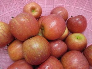 今日のデザートの果物は「りんご」です。酸味と甘みがおいしいりんごでした。
