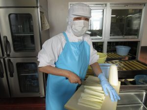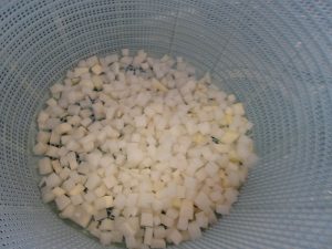 「ミネストローネ」です。だいこんやにんじんなどの野菜を小さい四角に切ります。