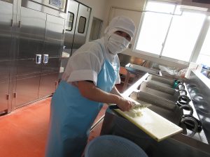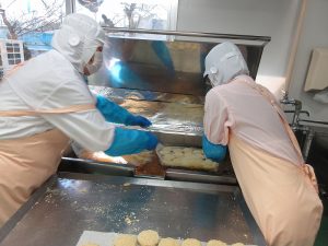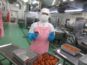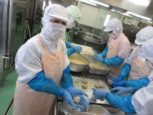 流れ作業でコロッケをつくります。まず一人分の重さを量ります。