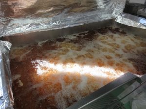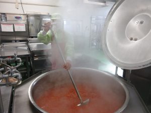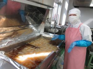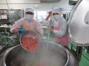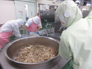 回転釜で、玉ねぎとひき肉を炒めて味をつけます。
