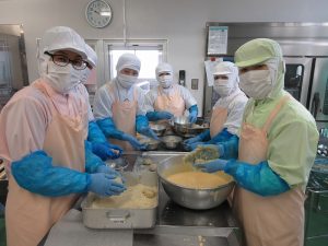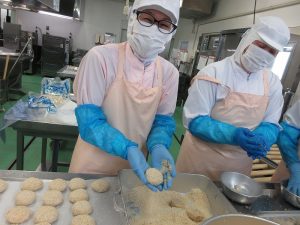 コロッケは、たくさんの工程があり、とても手間のかかる料理ですが、いつもおいしく作ろうと一生懸命がんばってくれる調理員さんたちの思いは、手作りの味わいとして子どもたちに伝わったと思います。