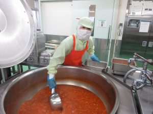 材料を炒めて、トマト味でじっくりと煮ていきます。
