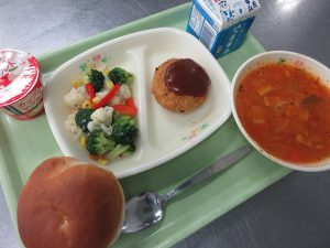 献立は、ミルクパン 手作りコロッケ(ソース) カラフルサラダ ミネストローネ カップdeヤクルト 牛乳でした。