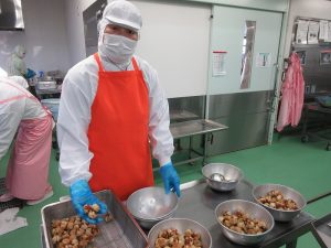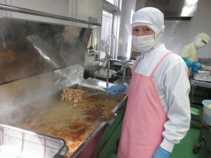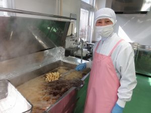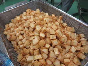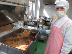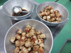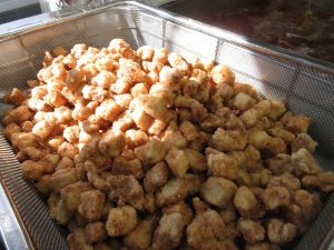 「揚げしゅうまい」です。今日は、いろいろな種類の食材をたくさん揚げました。揚げたしゅうまいにはタレをかけました。