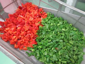 じゃがいもとピーマンは素揚げします。ピーマンの緑色とパプリカの赤色がきれいです。