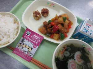 献立は、ごはん(ふりかけ) 酢豚 揚げしゅうまい わかめスープ 牛乳でした。