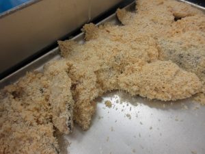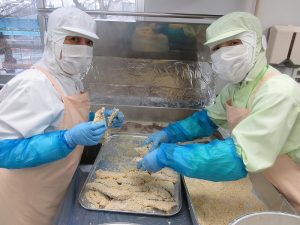 下味をつけた「ホッケ」にバッター液をまとわせて、パン粉をまぶします。
